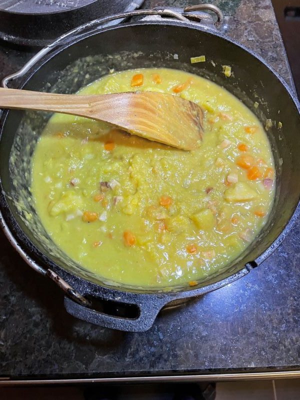 - Zwischendurch sollte man immer mal wieder umrühren und gegebenenfalls noch etwas Wasser auffüllen. Die Wassermenge, die hinzugegeben wird, hängt letztendlich auch von der gewünschten Konsistenz der Suppe ab. Wir sind der Meinung, dass man eine Erbsensuppe aus dem Dutch Oven auch mit der Gabel essen können muss. Schön sämig soll sie sein, ähnlich wie ein Erbseneintopf.