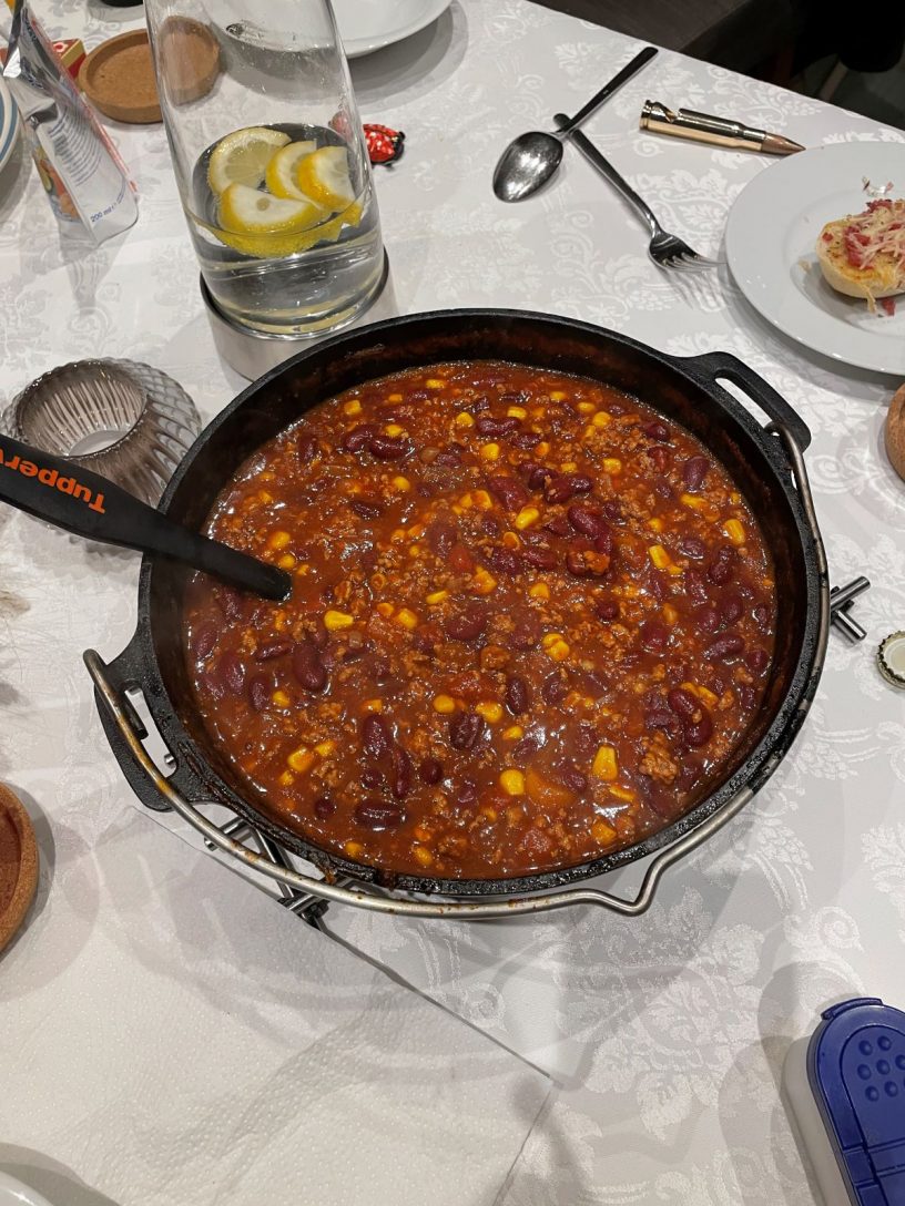 - Wenn die Briketts durchgeglüht sind, wird das Olivenöl im Dutch Oven erhitzt und das Hackfleisch zusammen mit den Zwiebeln, Knoblauch, Chilis und dem Tomatenmark darin angebraten. Wenn das Hackfleisch krümmelig gebraten ist, wird die Gewürzmischung drüber gestreut und kurz mit gebraten. Anschließend gibt man die Kidney Bohnen und den Maismix inklusive dem Saft, die geschälten und die passierten Tomaten hinzu.